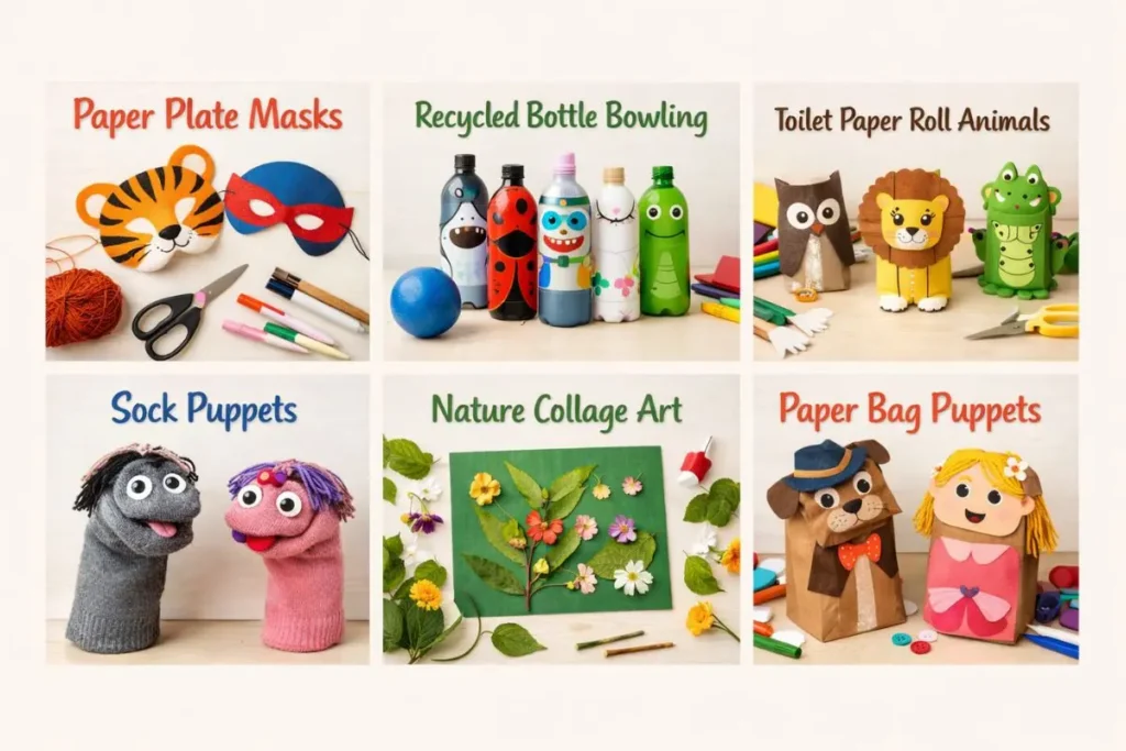 • Preschoolers (3-5 years): Paper plate masks, sock puppets, and nature collages.