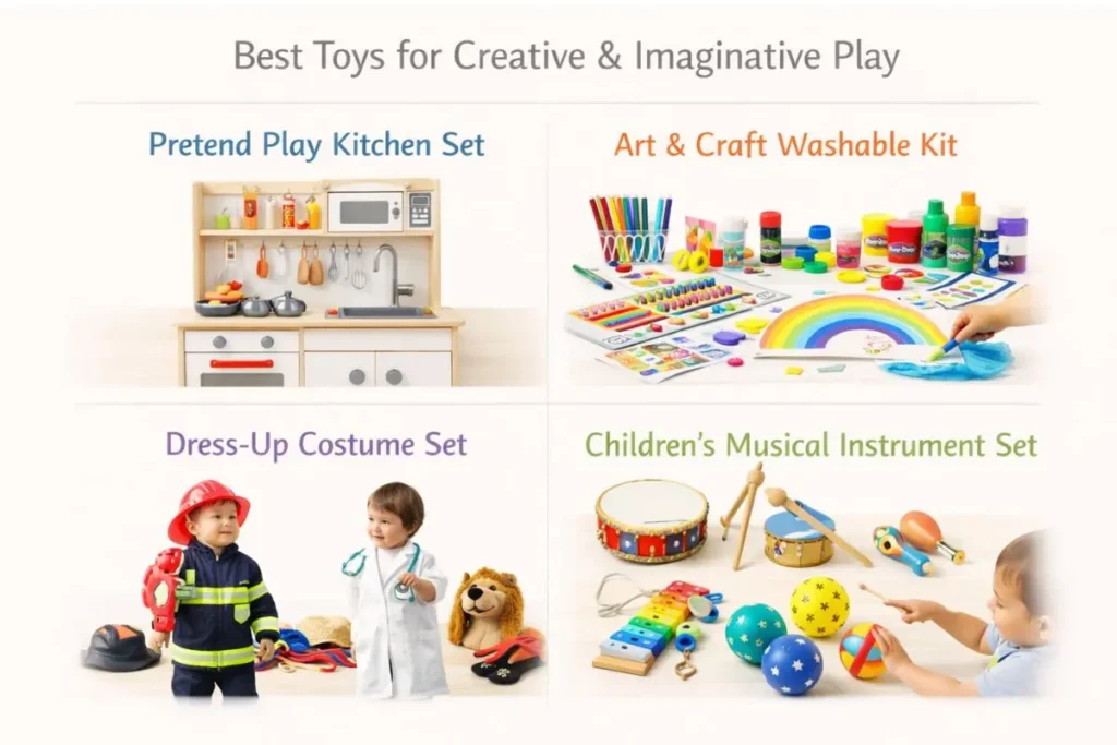 A toy kitchen set includes miniature kitchen items such as pots, pans, and utensils. This encourages role-playing and creative thinking as toddlers act out real-life scenarios.