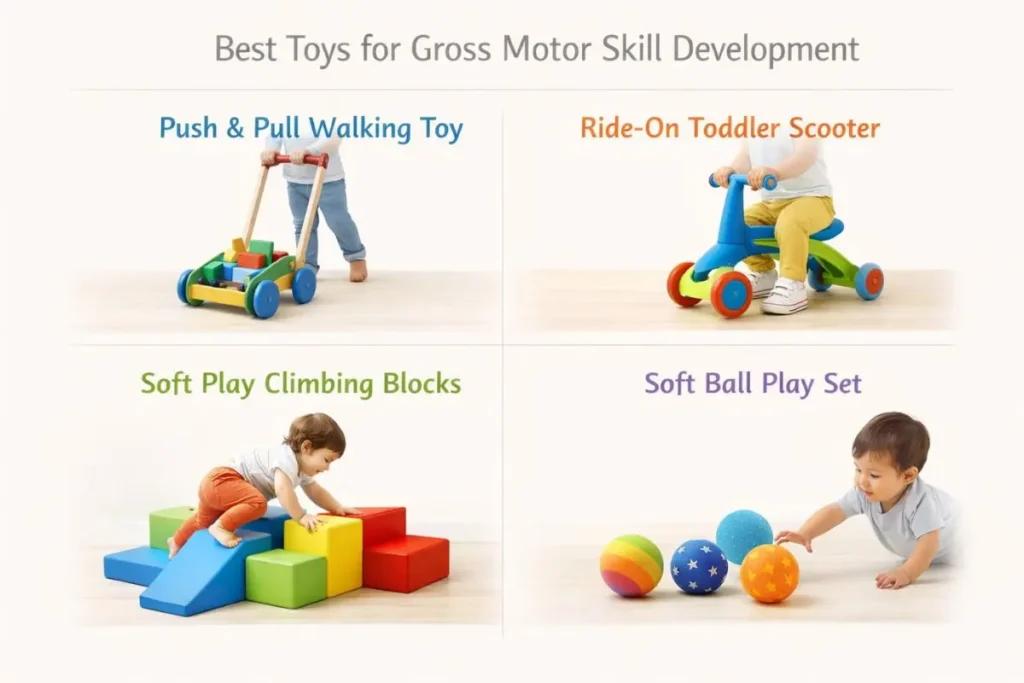 A scooter or ride‑on toy allows toddlers to use their feet to propel themselves forward, which improves leg strength and coordination.